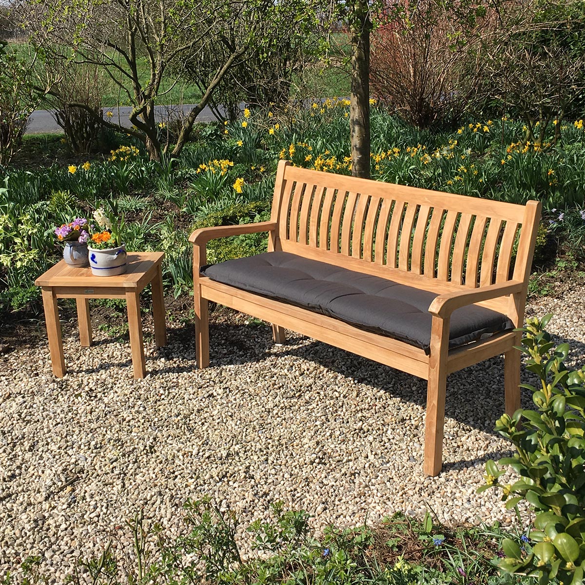 In Sachen Pflege ist Ihre Teakholz Gartenbank sehr unkompliziert: Wer den silbergrauen Look mag, kann das Holz einfach unbehandelt lassen – es vergraut mit der Zeit auf elegante Weise. Alternativ lässt sich die ursprüngliche Farbe durch regelmäßiges Ölen erhalten. Das passende Teak Öl finden Sie ebenfalls in unserem Shop.